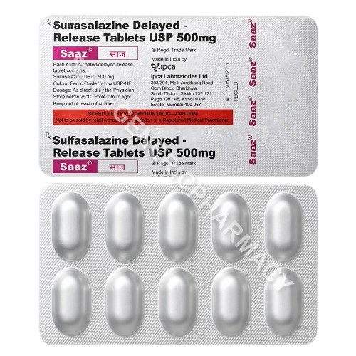 Saaz 500 mg Tablet is an oral medicine containing Sulfasalazine. It is used to treat inflammatory conditions such as rheumatoid arthritis and ulcerative colitis by reducing inflammation and modulating the immune response.